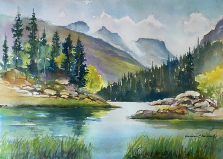 The Colors used are as follows: Sky and mountains: Ultramarine Blue, Sky blue, Burnt sienna and alizarin crimson Mountains: Ultramarine blue, Lemon yellow and Alizarin crimson/ Violet Trees: Lemon Yellow, Prussian/ Indigo blue and Cadmium yellow mix. Rocks: Burnt Sienna, Raw Sienna and Burnt Umber. Water: Sky blue/ Prussian blue tint. Reflections: lemon yellow and Prussian blue. Grass Green mix: Cadmium yellow Prussia blue and for the dark, Burnt Umber and Raw Sienna.